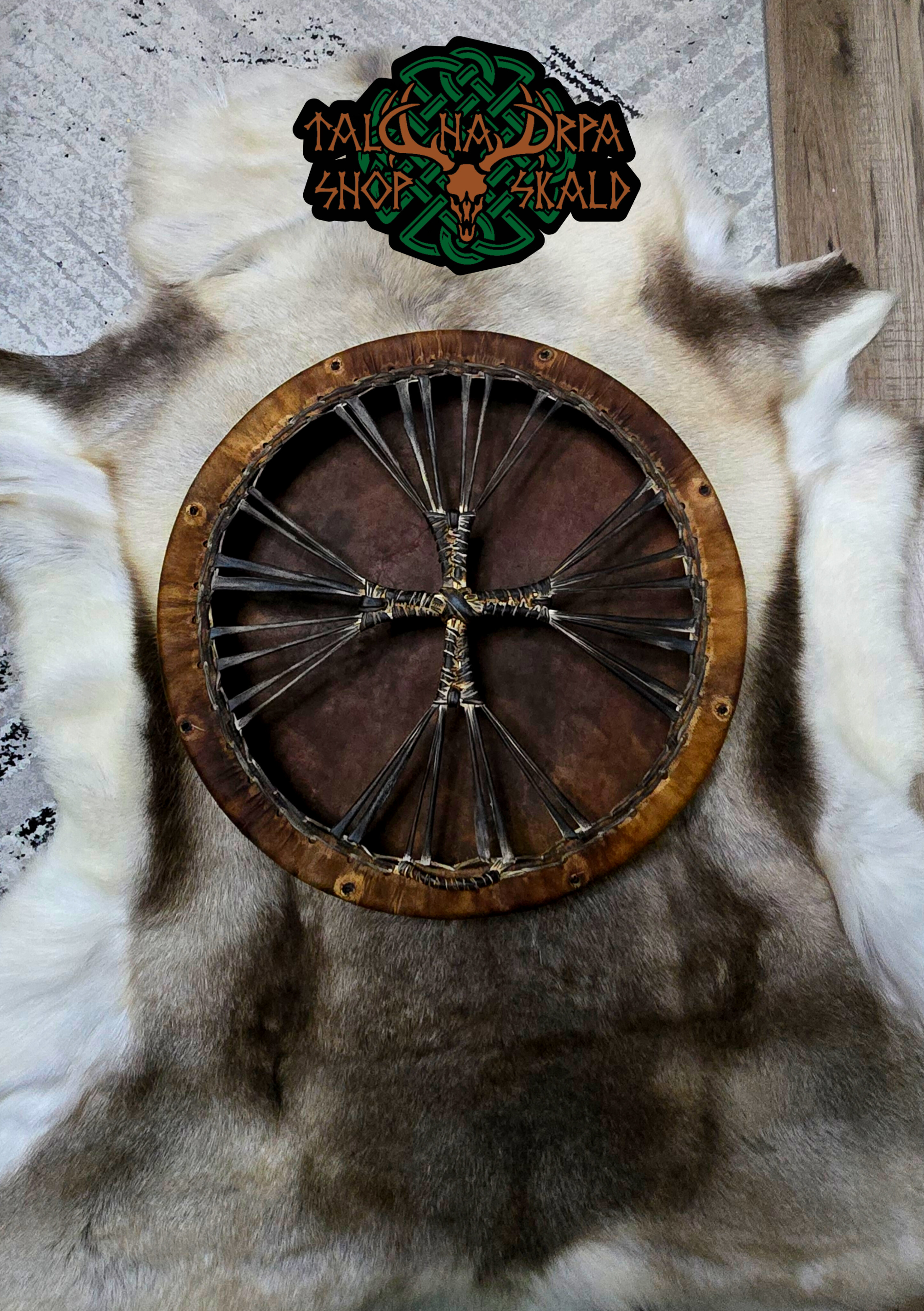 Shaman’s drum. Size 50×50 cm. The rim is made of ash, the membrane is goat skin, the handle is woven from genuine leather. The drum comes complete with a standard beat