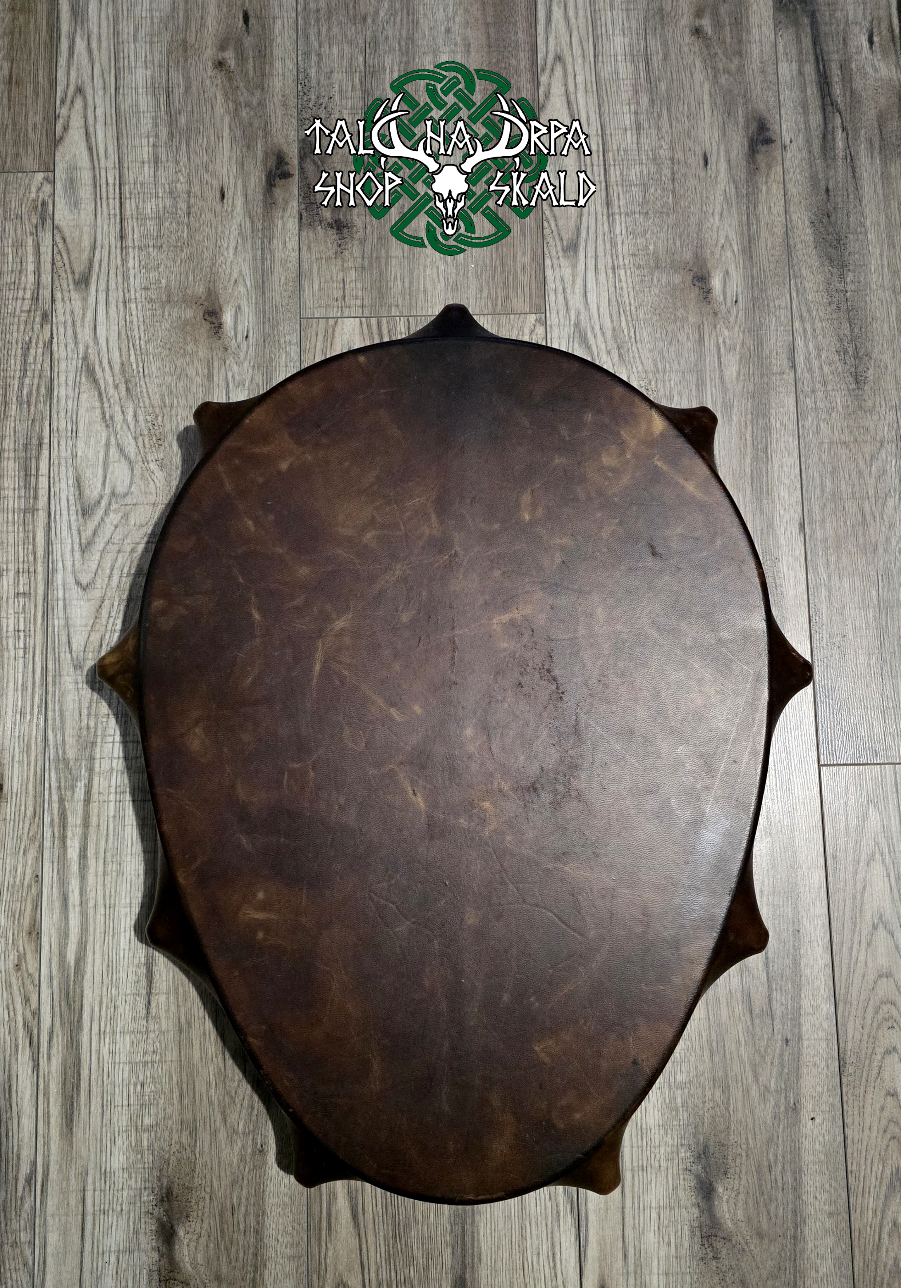 Shaman’s drum. Size 64×51 cm, with 9 horns. The rim is made of ash, the membrane is goat skin, the handle is woven from genuine leather. The drum comes complete with a standard beater.