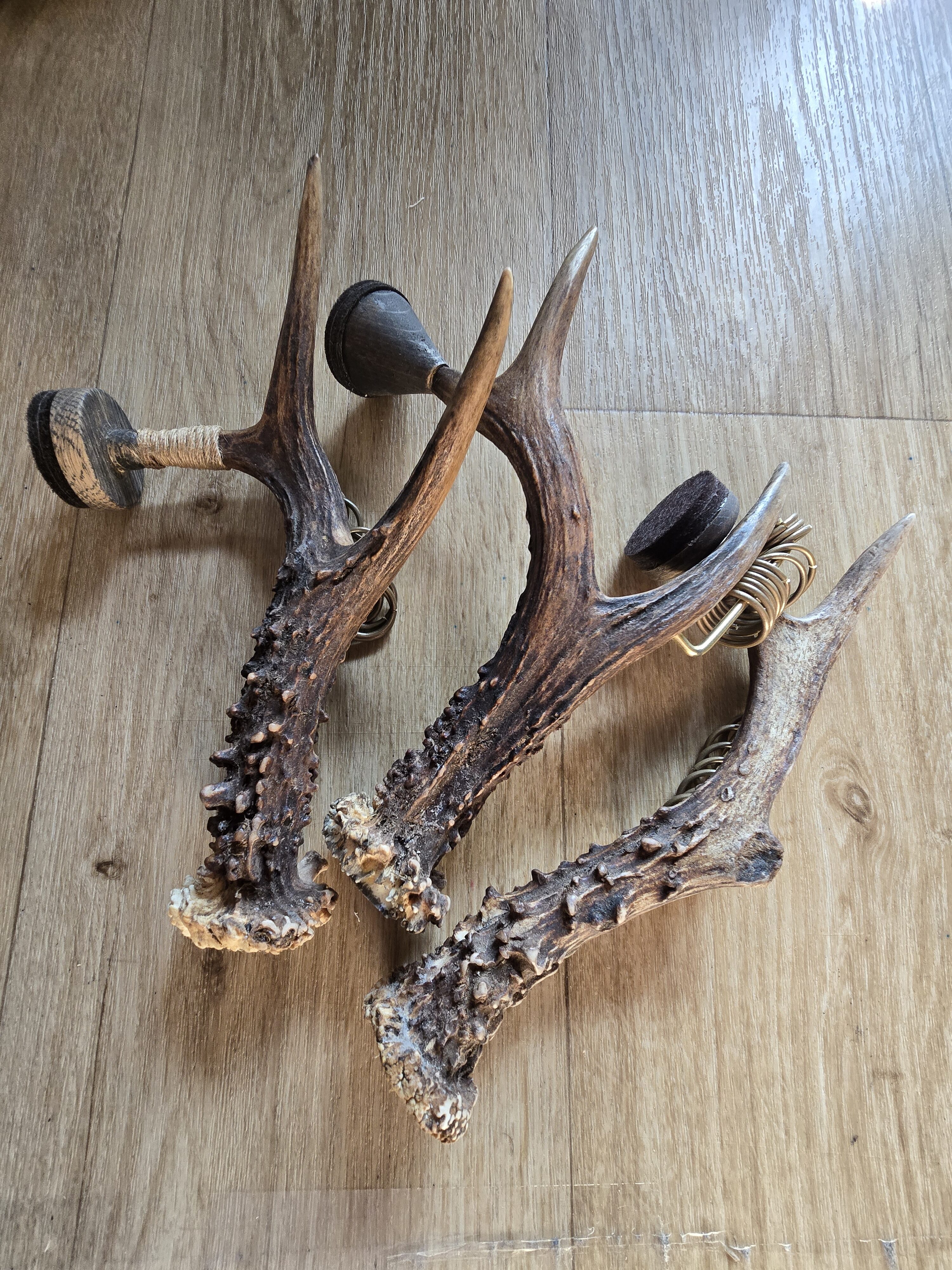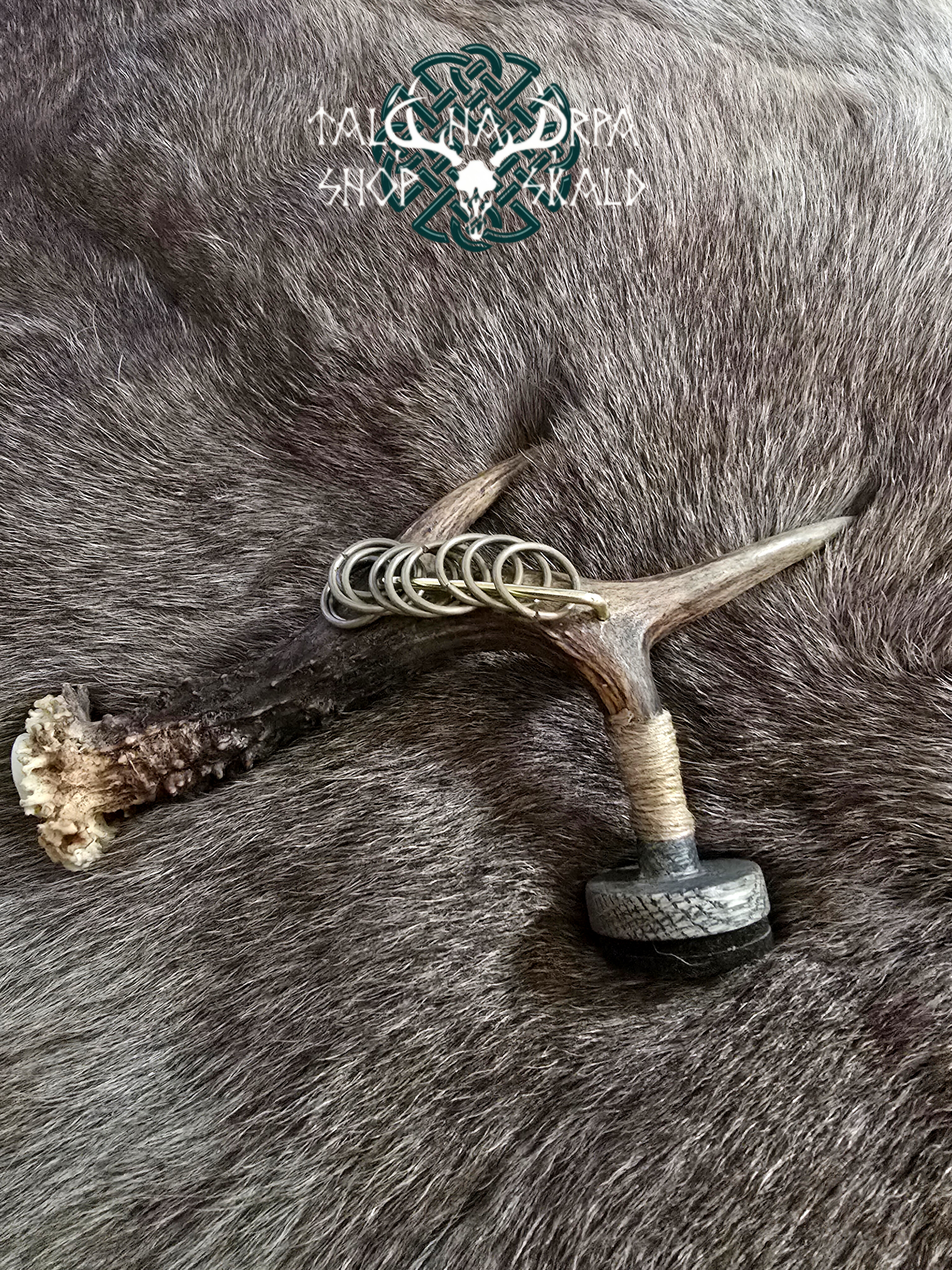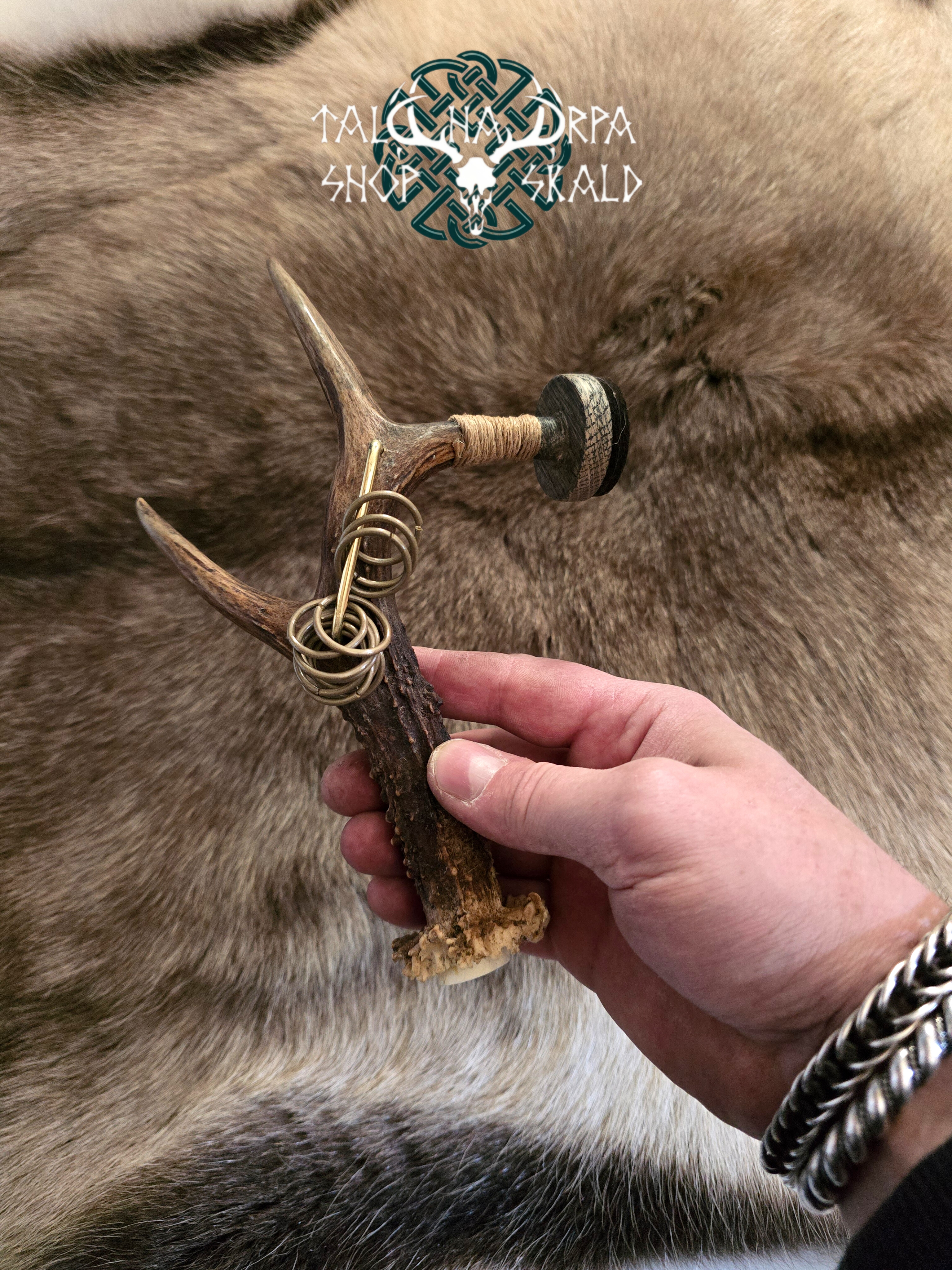 A rattle for a shaman’s drum. Length 20 cm, made of deer antlers, the tip is made of oak, the ringing part is a brass ring.