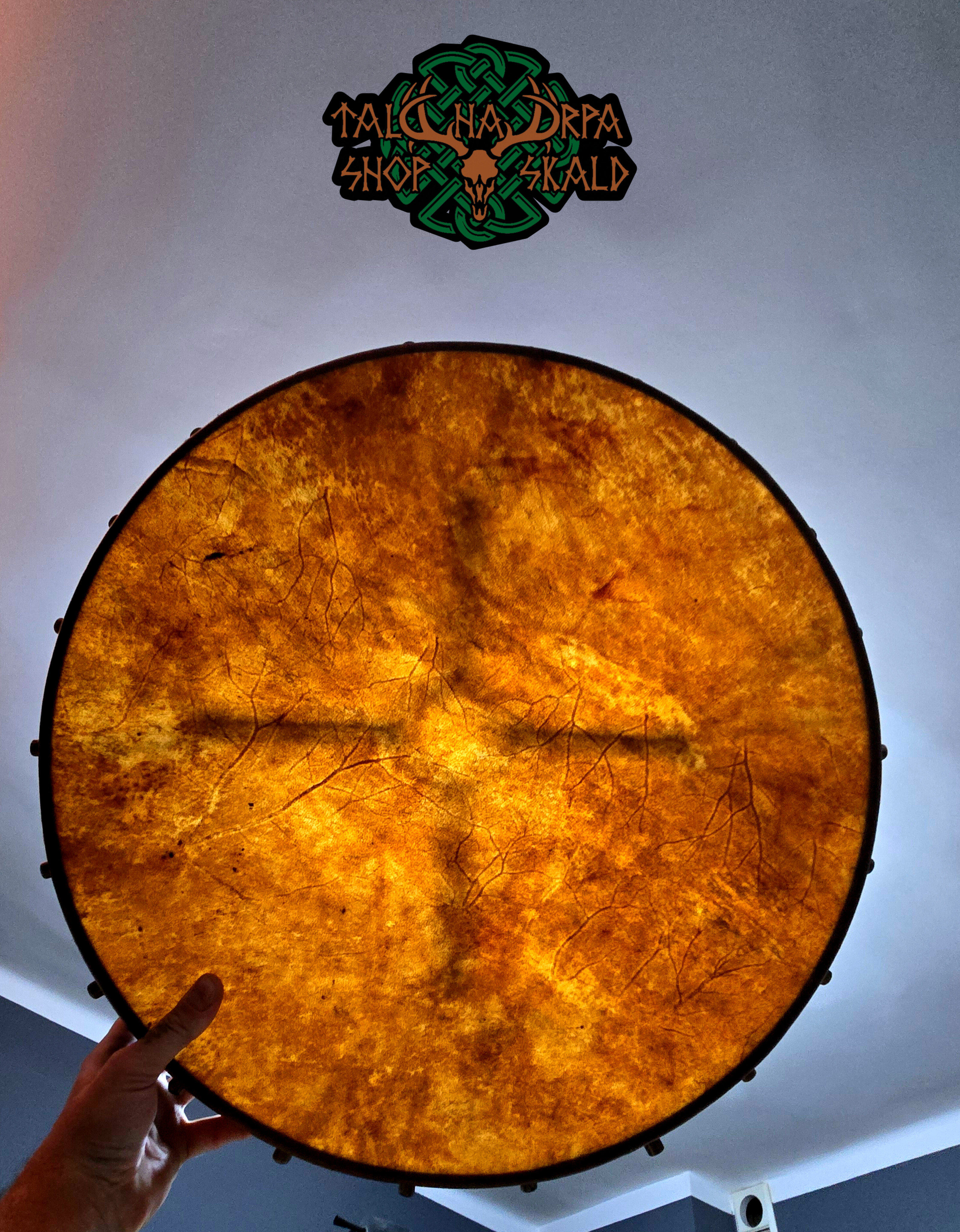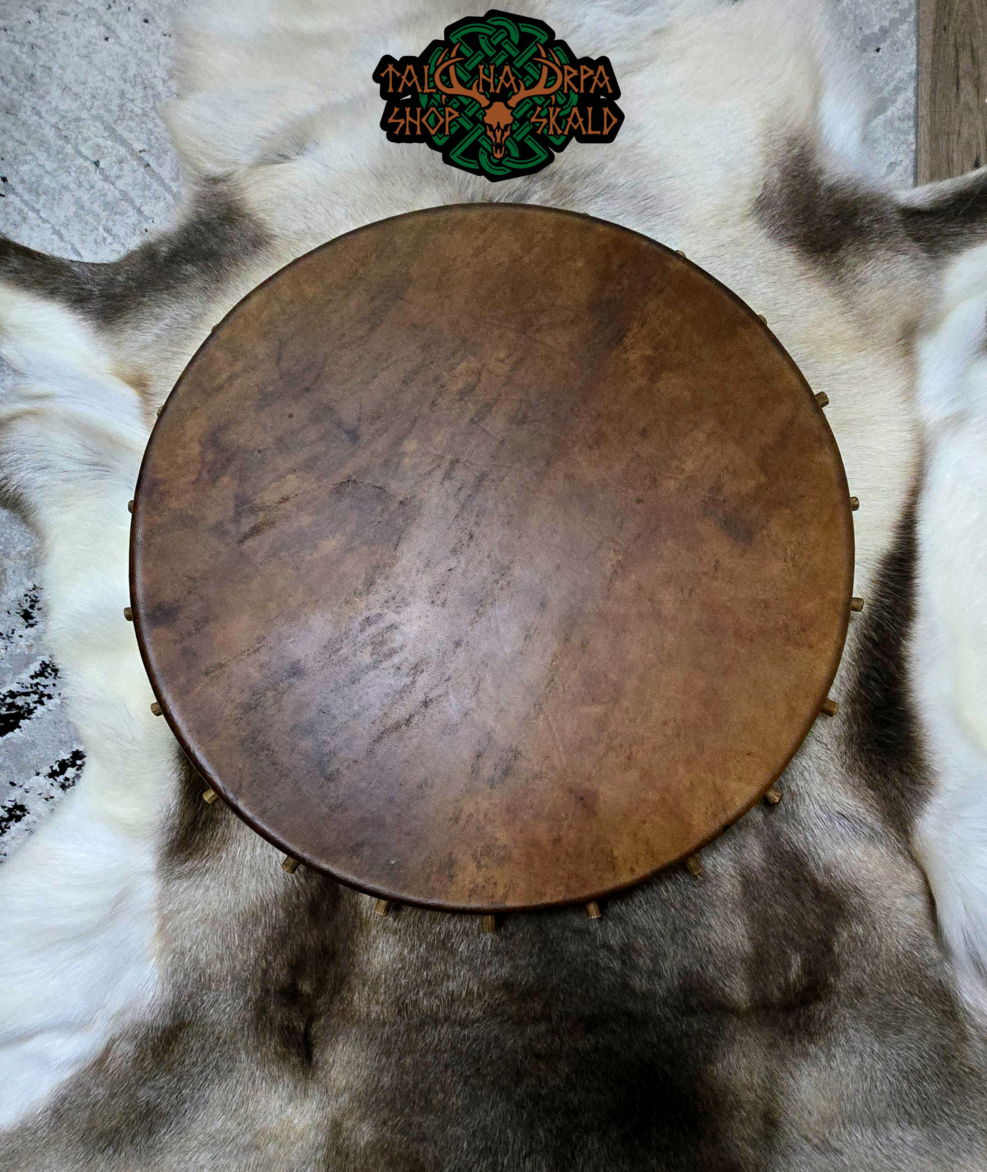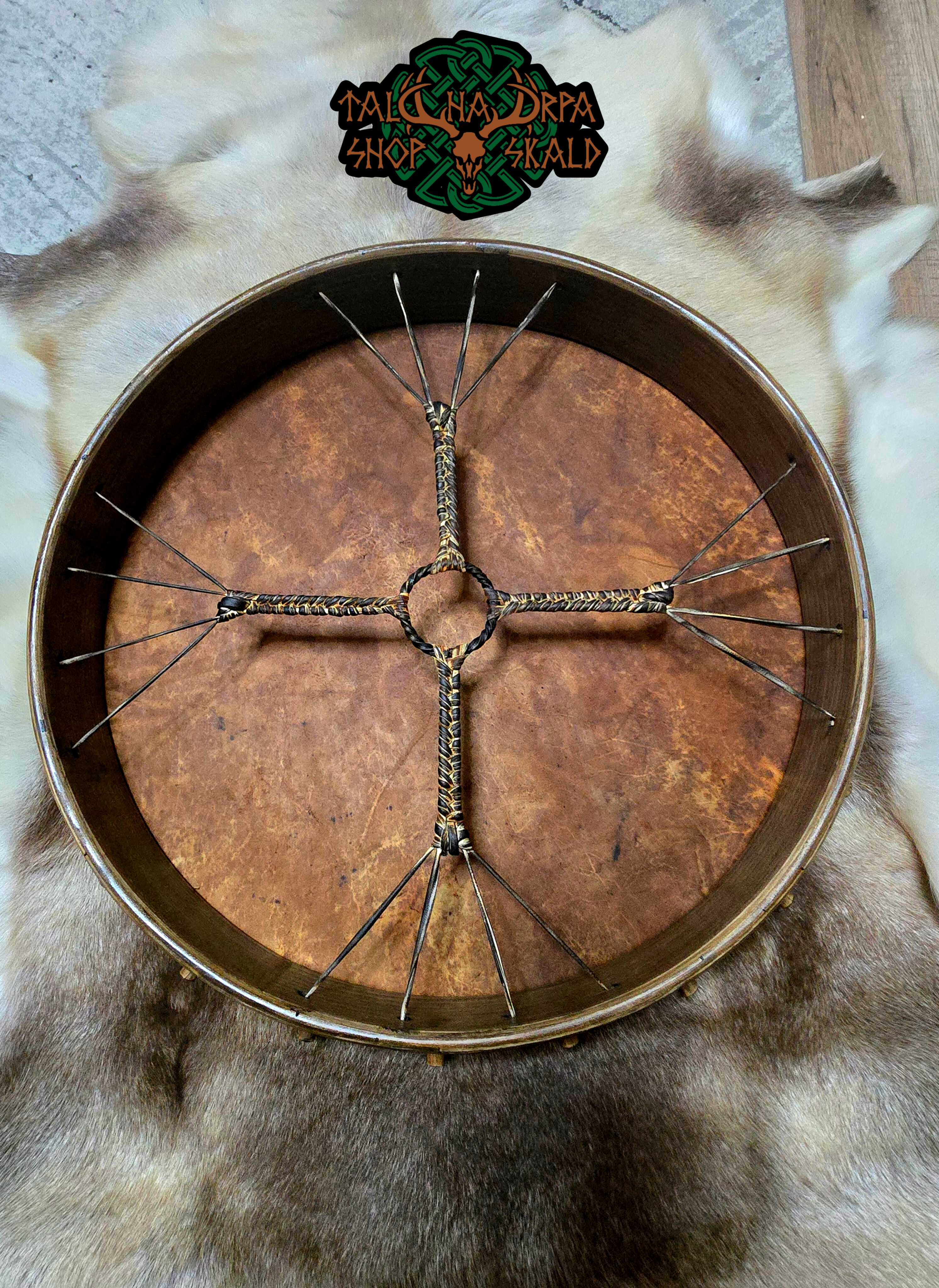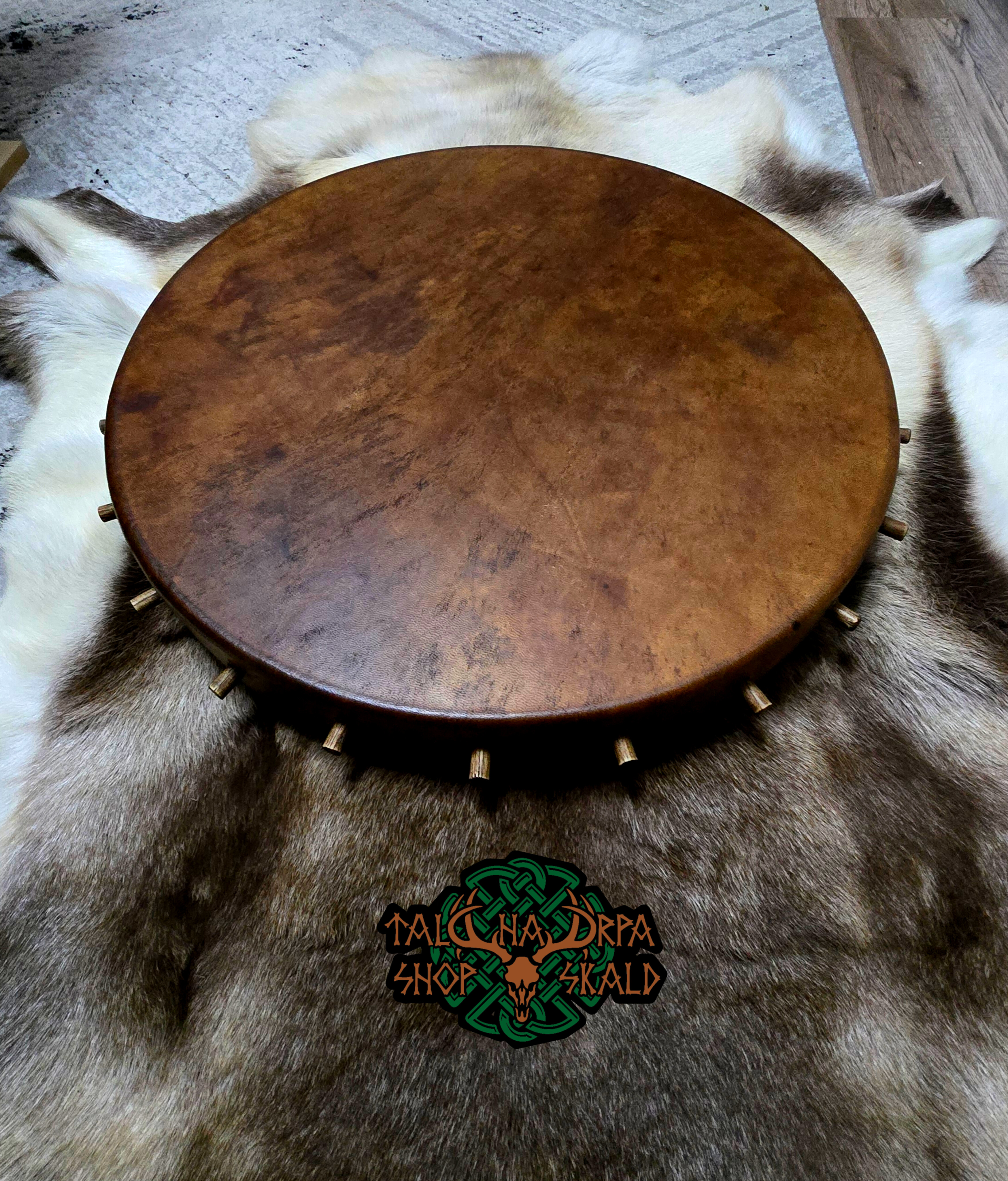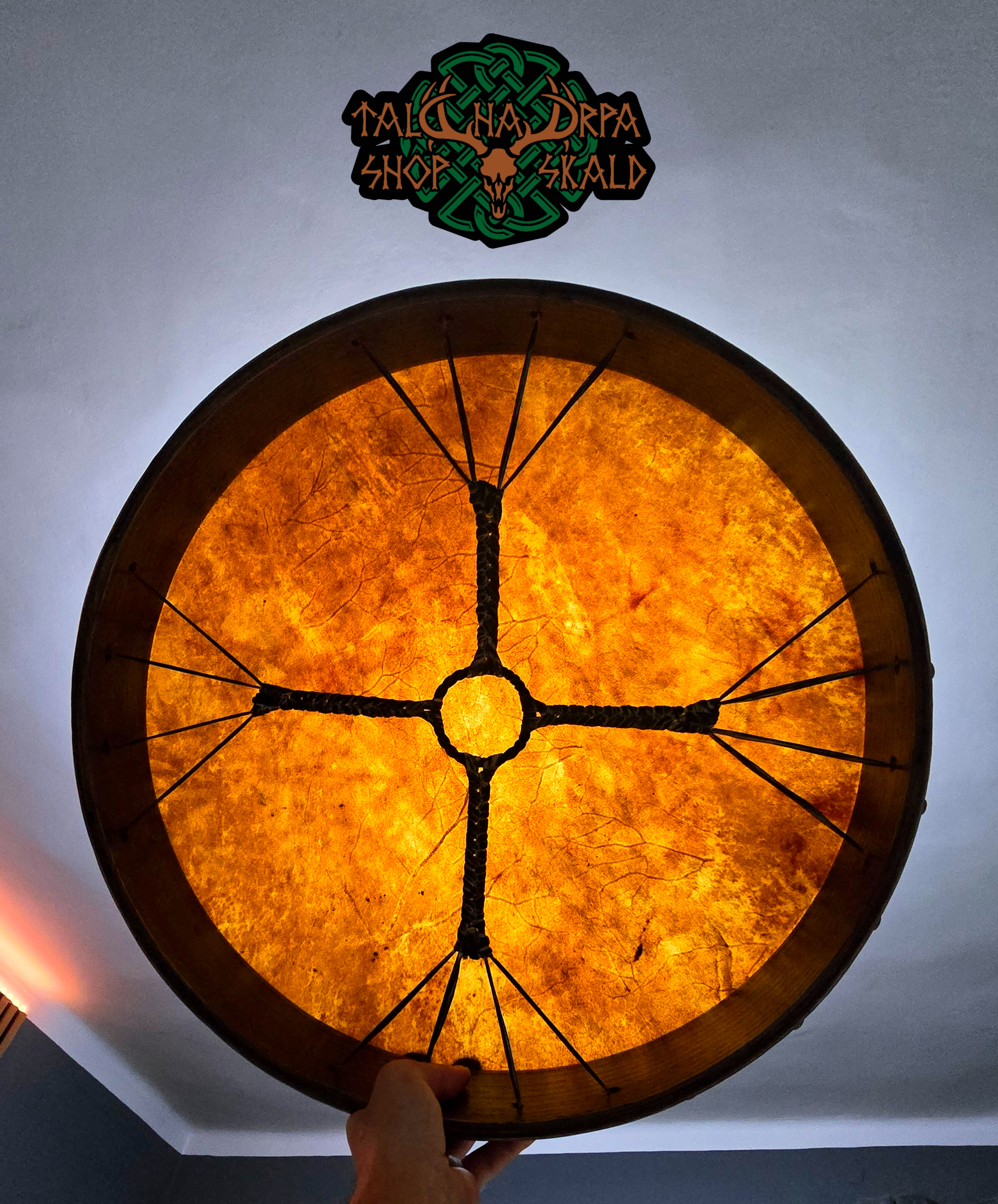 Shaman’s drum. Size 55×55 cm. The rim is made of ash, the membrane is goat skin, the handle is woven from genuine leather.Forged ring handle. The drum comes complete with a standard beat
